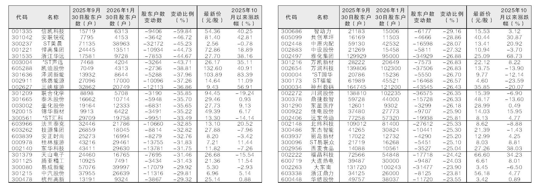 根据Wind数据统计,截至2月6日,已有858家公司披露截至2026年1月30日的最新股东户数。其中,50股股东户数相较2025年三季度末环比减少超过23%。从二级市场来看,泽润新能、雅化集团、三峡旅游等股股价2025年10月以来涨幅居前。
